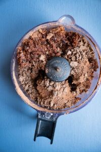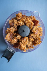- Add the pitted dates to the food processor and pulse until they become like this.