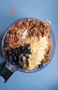 - When the dates are ready add the blueberries. vanilla, cacao, salt and nutritional yeast. Pulse until combined.
