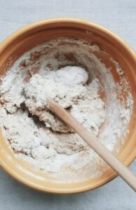 - Mix the flour and 285g of water in a big mixing bowl and cover it to autolyse until your leaven is ready, this will usually be around 2-3 hrs. Do not overmix, just leave it when it looks like this, all the flour does not have to be combined with the liquid. Overmixing Einkorn is a no go, so don't worry everything will be combined in due time.