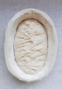- Now it is time to gently transfer the dough from the mixing bowl to the banneton basket. Generously flour the banneton basket (I use millet or white rice flour for this and I always use a linen insert for the basket, this makes it incredibly easy to transfer the loaf). Transfer the dough from the bowl to the banneton, be gentle, try to get it as smoothly into the basket as possible, we do not want those air bubbles to deflate. Cover the basket and leave it to rest for 1 hr 30 minutes in a warm spot. We want the centre of this dough to reach 75-76 ℉ before proofing it overnight in the fridge. I check the temp, simply by using a pen thermometer. just stick it into the dough during the end of the bulk fermentation. Reaching this temp will improve your loaf, so don't forget this simple trick!