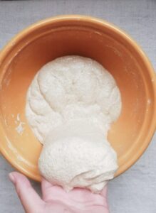 - Now it's time for the bulk fermentation. Fold the dough by stretching it so it covers itself without breaking, turn the bowl one quarter and repeat stretch and fold until you have done 4 sets. Cover the dough and leave it covered for 15 mins.