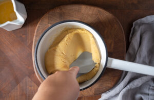 - I usually stir the dough a bit like this with a spatula, before I leave it to cool off. It speeds up the cooling process. The dough must be around 113-122℉ before you should add the eggs.