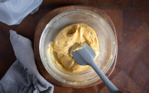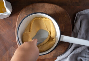 - Do not remove the saucepan from the heat, simply lower the heat to low/medium and add all of the flour at once while mixing vigorously until the dough is fully combined, do not despair if it looks lumpy at first, just keep whisking vigorously like your life depended on it! It will change, I promise.