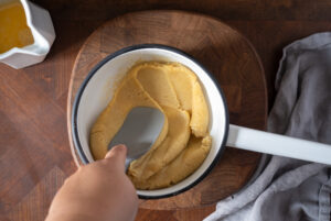 - If the bottom of your saucepan looks similar to this, then everything is just as it should be. Do not worry about it, it is normal and you should not try to scrape it off when you transfer your dough from the saucepan to a mixing bowl. Just put some hot water in your pan and leave it for 30 mins to soak. Then it will be easy to remove with a sponge.