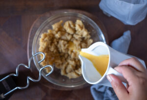 - Attach dough hooks to your handheld mixer or a paddle attachment to a stand mixer and add the 1st egg or similar to 1 egg of whisked eggs to the dough.