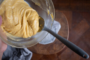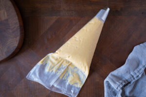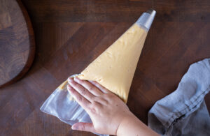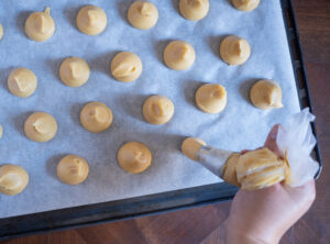 - Put the dough into a piping bag with a nozzle of your choice I use a French open star or a regular round tip for cream puffs.