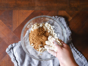 - Put all ingredients into a mixing bowl and mix them together with one hand as fast as possible.