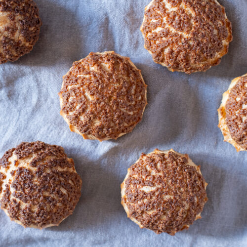 As the name suggests a “craquelin” is a crackling cookie that melts into the choux pastry. You could call it a little cake accessory that creates a crispy caramelization on top of your cakes, which helps the choux pastry to form evenly and yes, it also tastes great if you make it with proper ingredients.